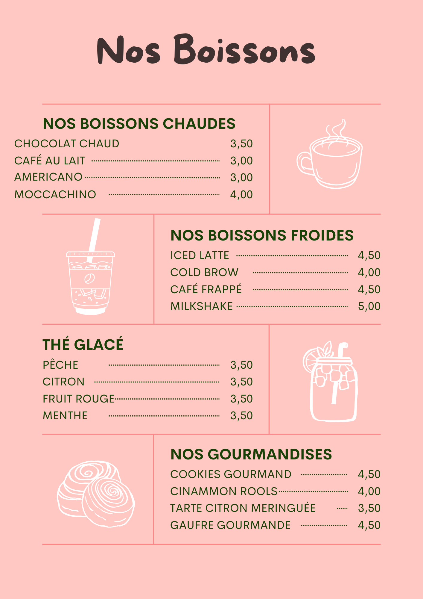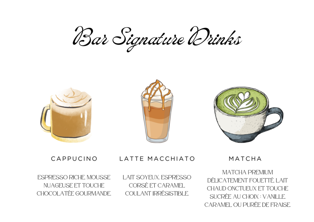 Venez savourer nos incontournables cappuccino, latte macchiato et matcha, ainsi que nos boissons chaudes et froides. Laissez-vous tenter par nos thés glacés et nos gourmandises pour une pause toute en douceur. ☕✨